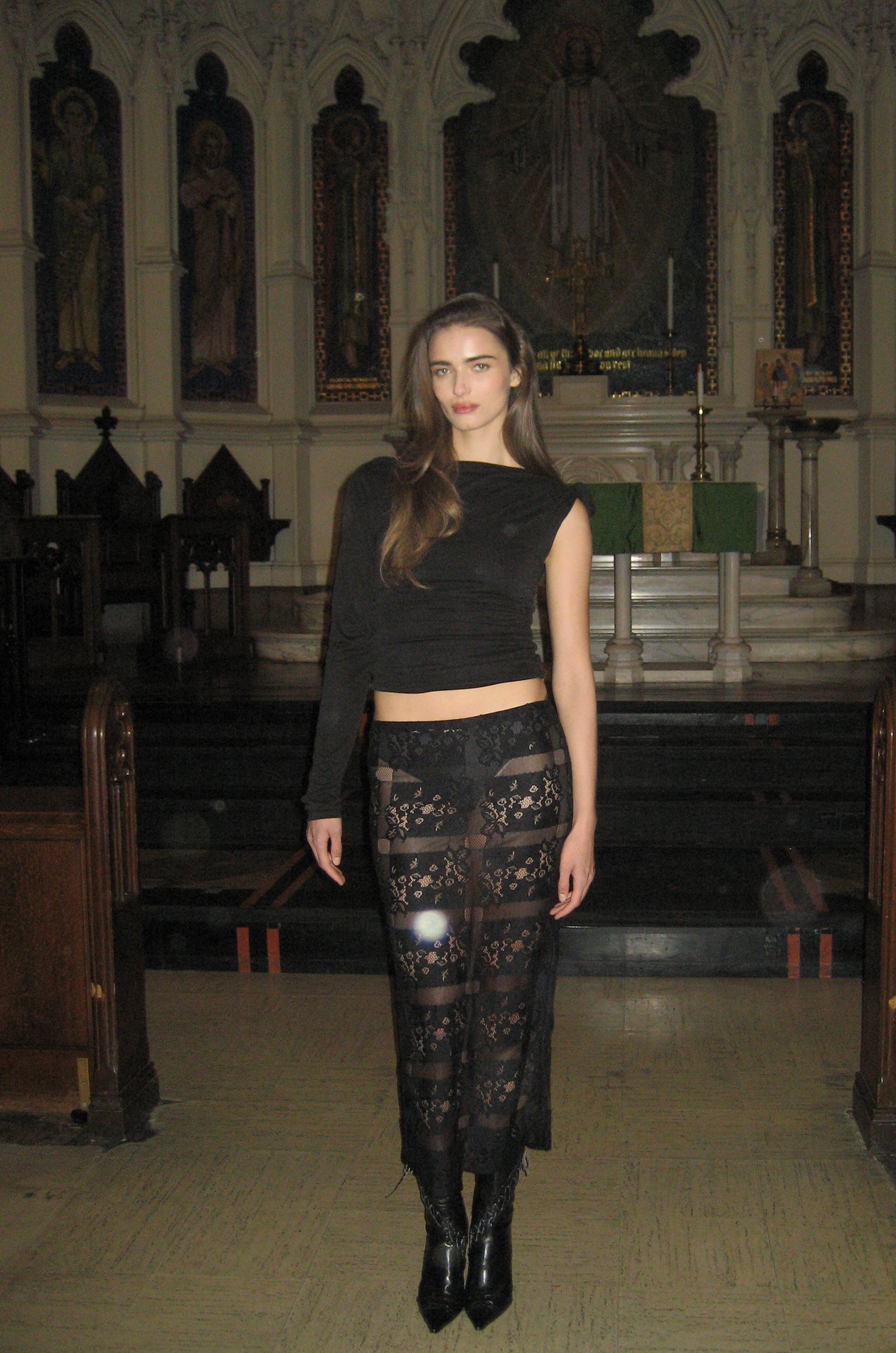The Holy Midi Skirt is a low rise. midi length skirt designed to be worn low on the hips featuring an elasticated waistband and leg split at the centre back bottom hem.